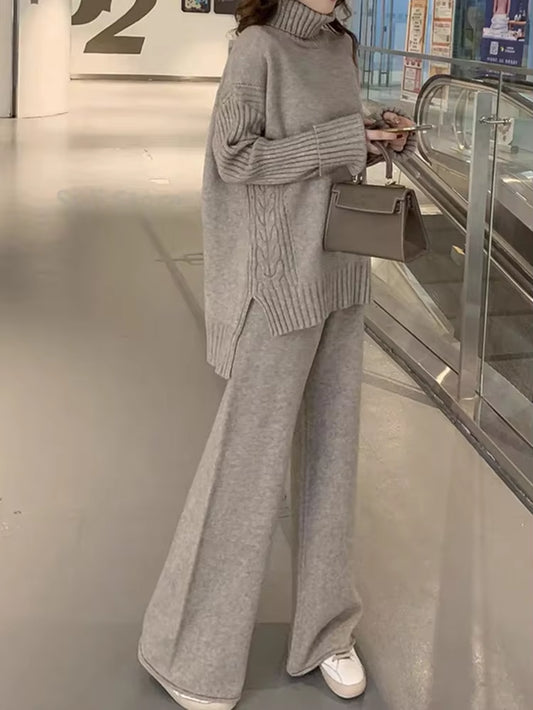 Solid Turtleneck Sweater + Loose Trousers Office Lady Suit Sweater Set Warm Suit for Women Winter Knitted Suits 2 Piece Set